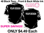 You are purchasing 48 Custom Black Regular Tees with a one color (white) print on front and back.